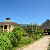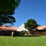 垣根仕立てのぶどう畑と広々とした緑のガーデンに囲まれた本店。